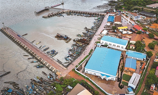 这是近日在几内亚比绍首都比绍拍摄的板丁渔业码头和中企投建的水产品加工存储综合设施(右侧蓝顶建筑区域)(无人机照片)。