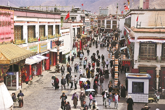 近期,西藏自治区拉萨市八廓街,游人正在逛街游览,感受民族风情。