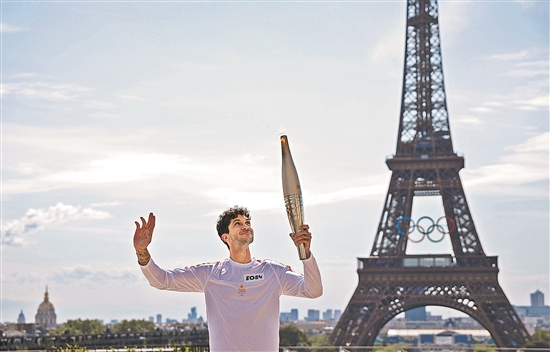 在法国巴黎特罗卡德罗广场,火炬手、法国BMX小轮车选手马蒂亚斯·当杜瓦手持火炬传递。新华社记者 曹灿 摄