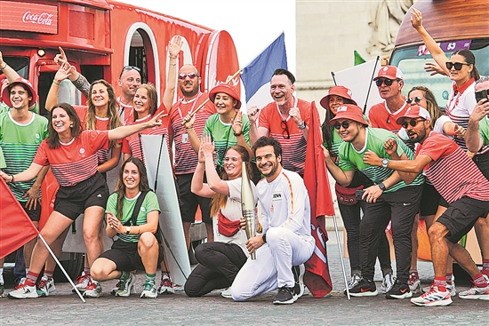 在巴黎凯旋门,火炬手阿米尔与表演者合影留念。新华社记者 许畅 摄