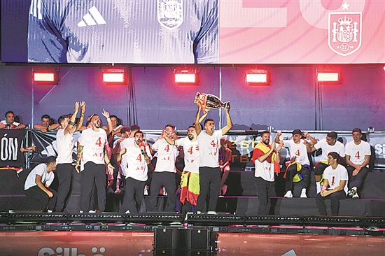 当地时间7月15日,西班牙队球员高举欧锦赛冠军奖杯,与球迷一同分享夺冠喜悦。