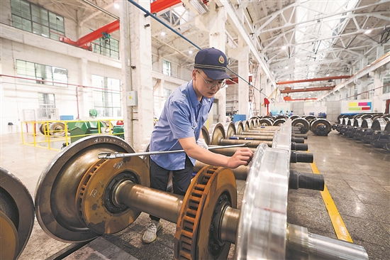 连日来,福建多地出现40℃以上的高温天气,为给旅客打造舒适凉爽的旅途环境,南铁福州车辆段干部职工顶着高温做好列车制动装置、空调装置、车电装置等关键设施设备的故障检修工作。图为车辆钳工在测量客车车辆轮对尺寸。