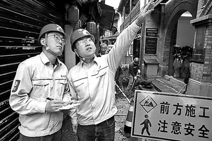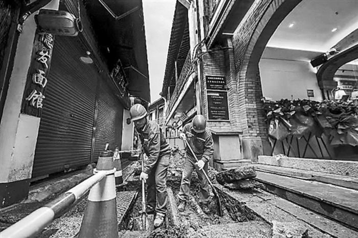 施工过程中,工作人员需先将350块平均重量达400斤的青石板掀开,在埋设电力电缆后,再恢复原样,原本简单的基础开挖工作不论难度还是工作量都呈几何倍数地增长。