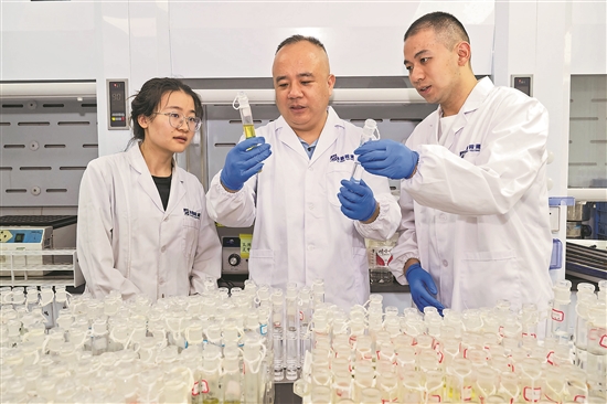 7月15日,在安徽省合肥庐阳经济开发区海峰分析测试科技有限公司劳模创新工作室,安徽工匠、合肥市劳动模范张勇(中)正在指导青年技术职工对水环境样本进行检测。