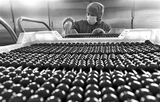 7月17日,山东淄博,在沂源县悦庄工业园一果脯加工企业,工人在包装加工的果脯。近年来,山东省淄博市沂源县依托当地丰富的果品、蔬菜等农产品资源,大力发展农产品深加工产业,建立起以果脯、薯片、果汁等多个食品加工产业集群,拉长了农业产业链,带动当地众多村民实现家门口就业增收。