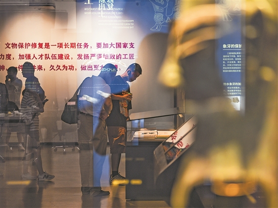 7月23日,四川省广汉市,游客在三星堆博物馆文物保护与修复馆内参观。多单位、多学科参与,3D打印、数字虚拟修复等新技术介入……7月23日,“匠心妙手——三星堆遗址新出土文物保护修复成果展示”在四川广汉三星堆博物馆文物保护与修复馆正式开幕,展示近一年来三星堆新出土文物保护修复成果,讲述文物保护背后的故事。