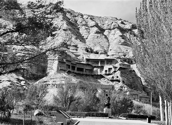 这片白杨,笔直的干,笔直的枝,与土黄色的山体交相辉映,在孤独而漫长的岁月中,守护石窟,经历风雨。