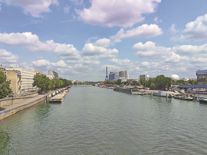 当地时间7月25日,巴黎塞纳河上的景色,远处是著名的埃菲尔铁塔。巴黎奥运会开幕式即将在塞纳河两岸上演。