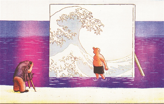 海边竖起波浪涛天的景版,“勇敢者”伫立期间,摆出“胜似闲庭信步”的架势……经过特写和加工创作出“驾驭潮流”的好汉大作。