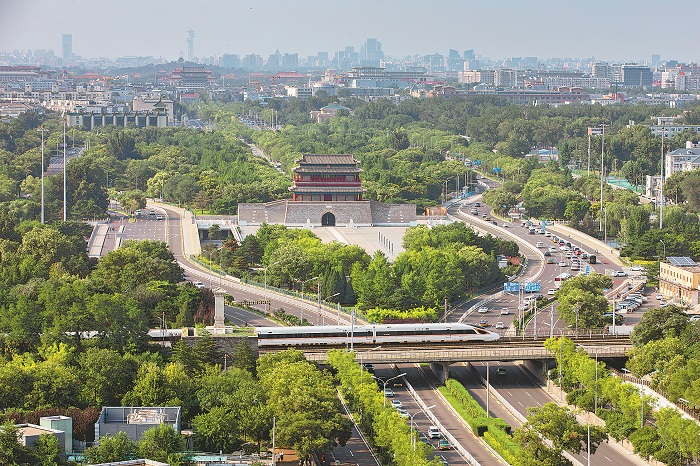 图为7月27日,复兴号动车组列车经过位于北京中轴线上的永定门前。