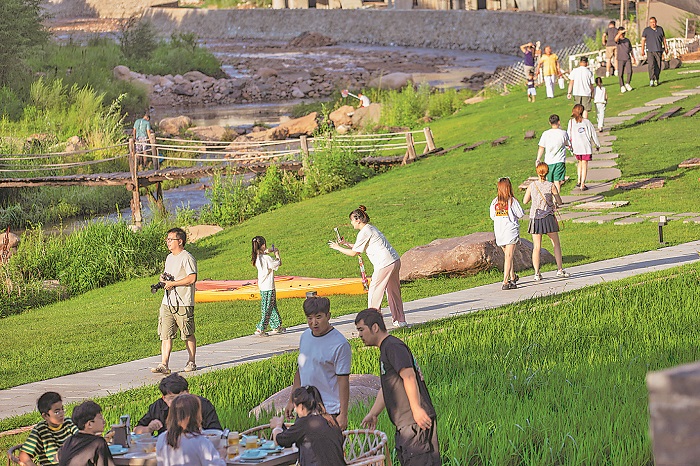 7月26日,在河北省承德市隆化县,游人正在热河谷温泉度假区游玩。