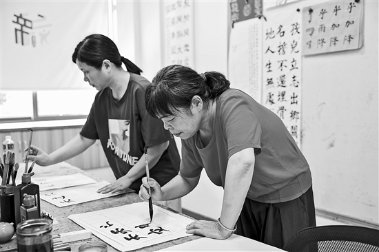 近日,居民在浙江省嘉兴市南湖区东栅街道新南社区邻里中心写书法。暑期期间,该区下属各街道社区及乡镇依托党群服务中心、文明实践站等场所,重点关注“一老一小”群体,在炎炎夏季让居民在“家门口”就能享受便利多样的暑期活动。新华社记者 徐昱 摄