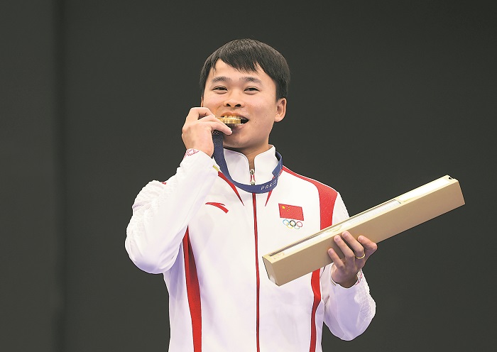 北京时间7月28日,在巴黎奥运会射击男子10米气手枪决赛中,中国选手谢瑜夺冠。新华社记者 赵丁喆 摄