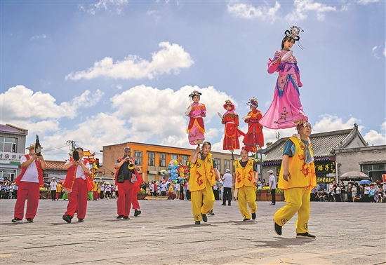 7月25日,脑阁表演队伍行进在隆盛庄街道上。