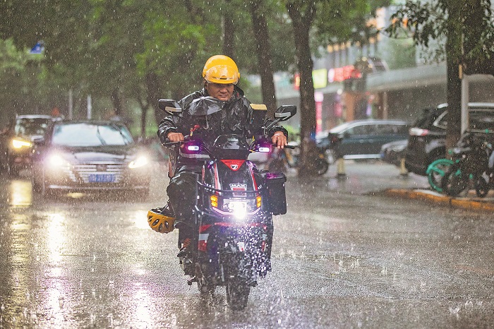 当日,受副热带高压外围偏南气流和高空槽的共同影响,北京市处于暴雨蓝色预警中。为了保障城市的有序运行和满足市民的生活需求,外卖骑手、快递小哥、环卫工人等户外工作者穿行在风雨中,给市民带来便利。