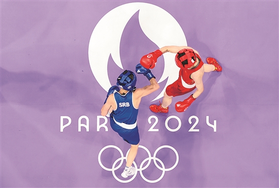7月31日,在北巴黎竞技场举行的巴黎奥运会拳击项目女子60公斤级四分之一决赛中,中国选手杨文璐战胜塞尔维亚选手纳塔利娅·沙德里娜,晋级半决赛。图为杨文璐(右)在比赛中。