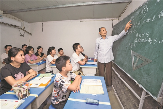 早晨七点,大伦镇申扬村退休教师马如松的家里热闹起来,马老师手握三角尺、粉笔,在黑板上边画图边讲解几何题,讲台下十余名学生做着笔记。