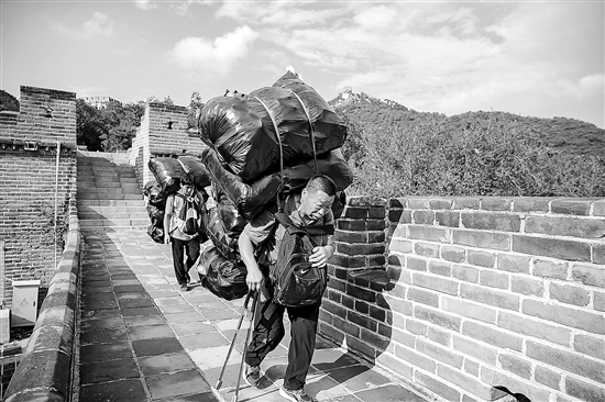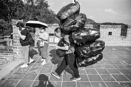 北京八达岭长城是大客流景区,每天都有大批中外游客来此观赏游览。为维护景区环境清洁,这里有一个由80人组成的保洁队,成员大部分是来自景区周边乡镇的村民,负责八达岭长城北线和南线的垃圾清运工作。这些保洁员平均年龄将近50岁,每人每天要扛起近百斤的垃圾,用人力一步步运到长城脚下,被游客亲切地称为“长城美容师”。