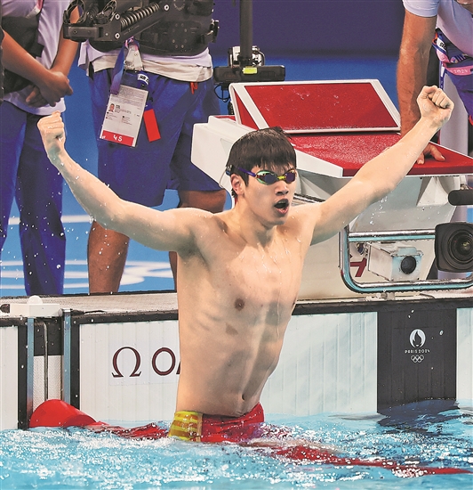 “wonderful ending”(精彩的结束),当中国选手潘展乐夺得巴黎奥运会男子100米自由泳冠军后,坐在我旁边的法国记者对我竖起了大拇指,这是7月31日晚游泳比赛的压轴之战。我对他说,这对中国游泳来说,其实是一个“wonderful beginning”(精彩的开始)。