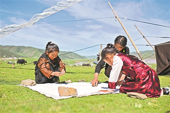 8月1日,尕玛拉毛(左)在帮妈妈晒曲拉(一种奶制品)。