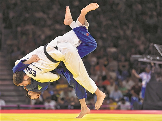 8月1日,在柔道男子100公斤级铜牌赛中,乌兹别克斯坦选手图罗博耶夫(下)战胜西班牙选手谢拉扎迪什维利。