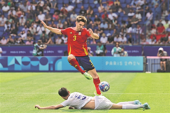 7月24日,男子足球C组首场比赛打响,西班牙队击败乌兹别克斯坦队取得开门红。图为西班牙运动员带球突破。