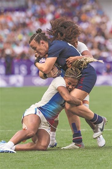 7月29日,在七人制橄榄球女子组比赛中,东道主法国队(左)和美国队在比赛中激烈争夺。