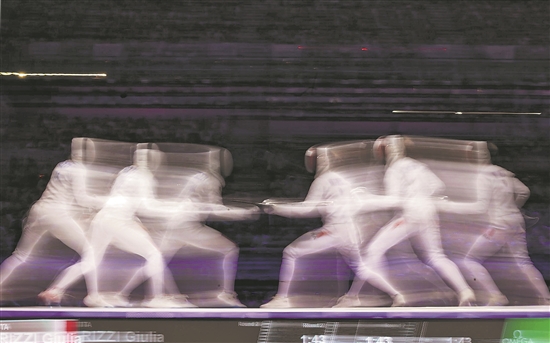 7月31日,击剑项目女子团体重剑决赛在巴黎大皇宫举行,意大利队(左)战胜法国队获得金牌。