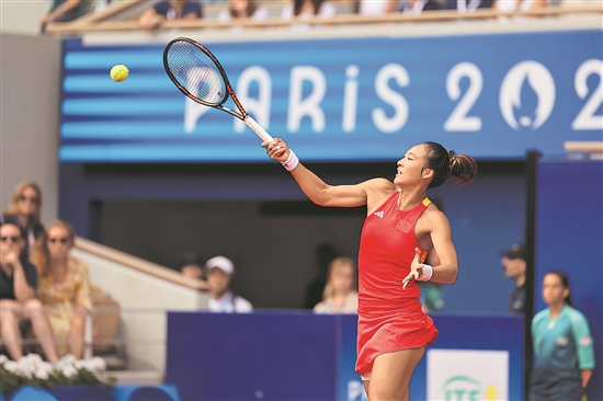 当地时间8月3日,在巴黎奥运会网球女子单打决赛中,中国选手郑钦文战胜对手夺得金牌。这是中国网球首枚单打奥运金牌,实现了中国选手在该项目上的历史性的突破。图为郑钦文在比赛中。本报特派记者 杨登峰 摄
