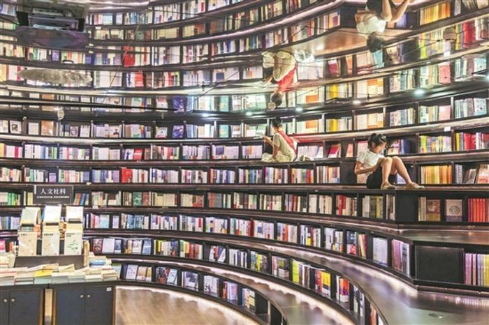 7月28日,浙江杭州,“网红书店”钟书阁,室内空间大量运用镜面元素,营造出亦真亦假的视觉效果。除了以白色圆柱书架为主的森林阅读区、镜面阅读长廊,还有天花板装满镜子的环幕阅读大厅,坐在书架台阶上的读者仿佛“书海悬浮”。左冬辰 摄/视觉中国