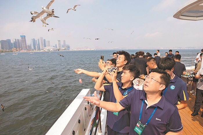 8月4日,辽宁大连,参加2024年(大连)全国职工足球邀请赛的16支参赛队的队员在比赛间隙乘坐游艇“海上游大连”。
