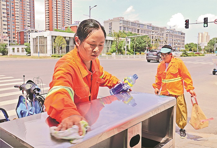 设置环卫工人休息点,提供电风扇、饮水机、微波炉、桌椅等设备,方便环卫工人休憩使用,发放防暑降温物品,调整作业时间,增加机械化清扫和洒水频次……针对夏日持续的高温天气,淮阴区环卫部门采取各种办法关心关爱环卫工人,改善尹永美和工友们的工作条件。