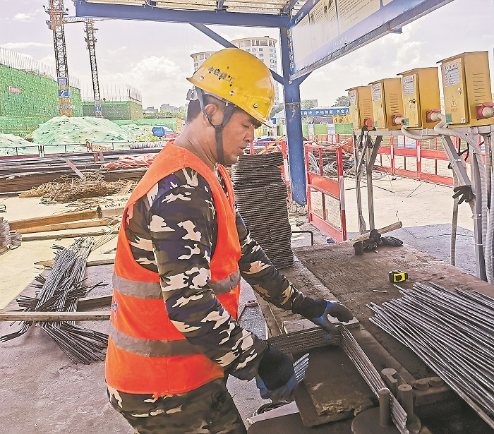 “我们班组每人每天大约要负责10平方米的区域,绑扎钢筋的重量超过3吨。”建筑工人林宝荣仔细地绑扎钢筋,豆大的汗珠不停地从额头上流下。当日,户外气温高达35摄氏度左右,而被晒得滚烫的钢筋,温度更是超过50摄氏度,林宝荣和工友距离钢筋不到30厘米,直面“烘烤”。