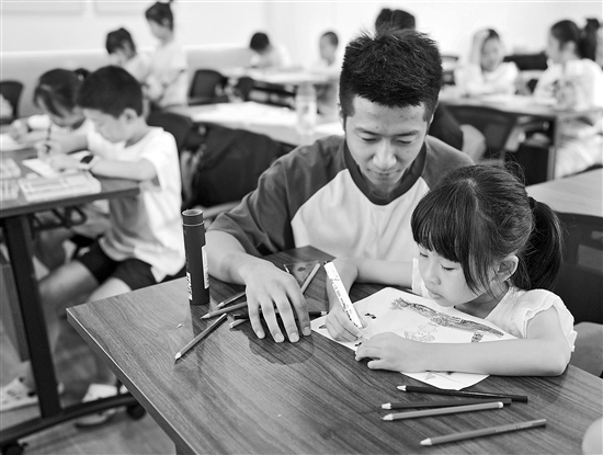 为解决外来务工家庭暑假“带娃难”的问题,浙江湖州吴兴区爱山街道整合企业工会、幸福邻里等资源,开设“小候鸟”文明课堂,开展趣味手工、实践体验等课程,让孩子们度过一个快乐暑假。图为企业志愿者带着“小候鸟”开展绘画活动。