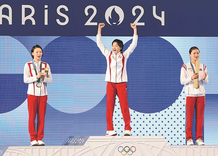 图为全红婵(左二)、陈芋汐(左一)在颁奖台上。本报特派记者 杨登峰 摄