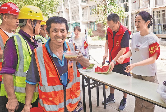 8月5日,安徽省马鞍山市花山区江东街道乔山社区党委联合工会驿站,开展“致敬高温下的一线工作者”活动,组织党员和楼栋长来到花山区人居环境改善提升工程(二期)桥山嘉苑项目工地,为在高温下奋战的施工作业人员送上绿豆汤、西瓜和防暑降温药品,并开放乔山社区工会驿站供一线工作者避暑休息。本报通讯员 胡智慧 摄