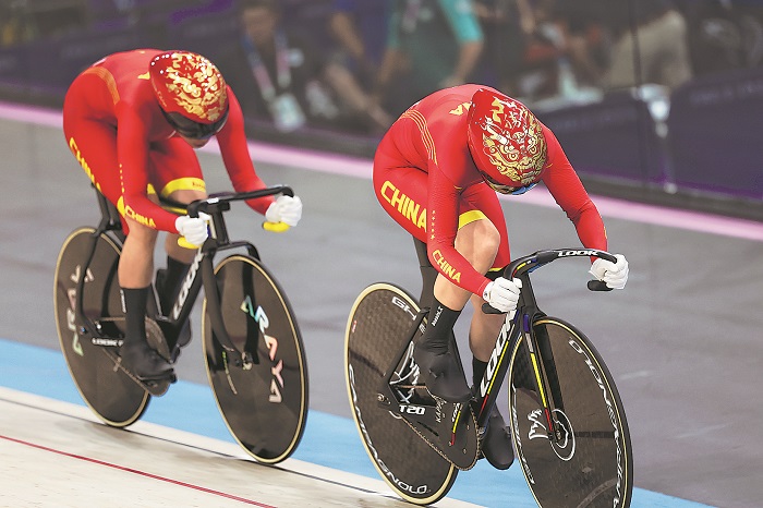 北京时间8月6日凌晨,在巴黎奥运会场地自行车争先赛中,中国队获得女子团体第六名。图为中国选手在女子团体争先赛首轮比赛中。