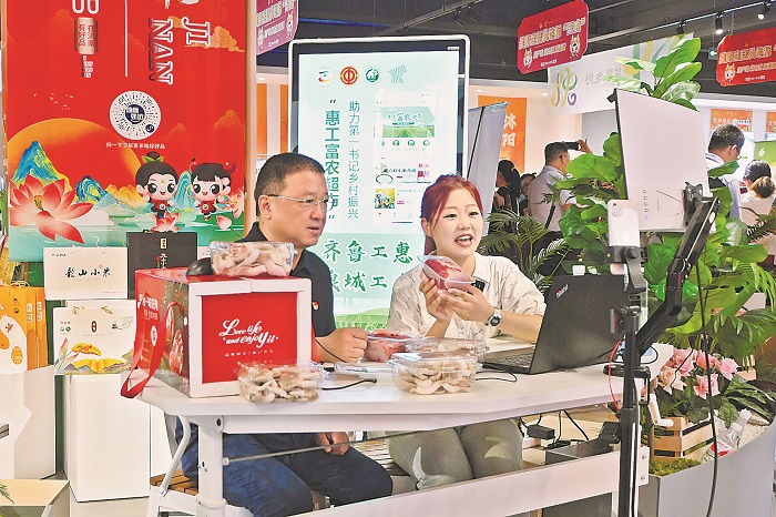 近日,山东省济南市总工会开展“惠工富农超市”线下大集助力乡村振兴活动。现场设置销售展台20个,展销农副产品百余款。同时设立直播场地,由专业主播配合驻村第一书记、当地农户走到镜头前,对各自农副产品进行展示宣传,让乡村农副产品插上“数字翅膀”,“飞”入千家万户。