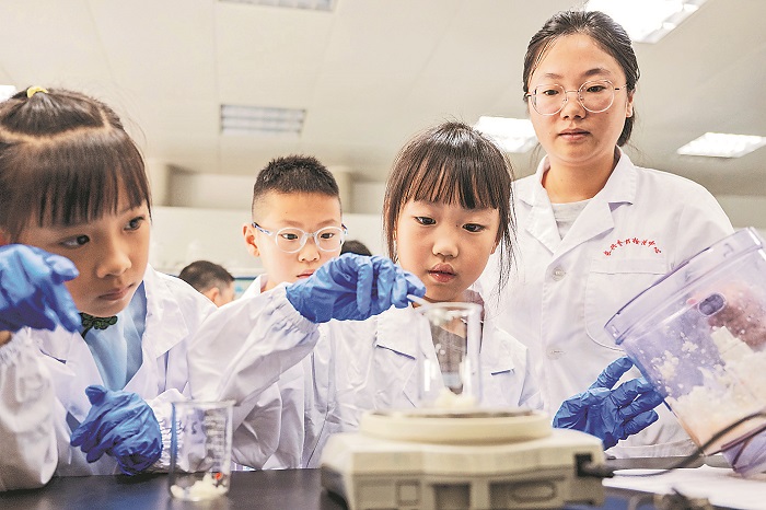 当日,浙江省湖州市长兴县食品药品检验检测中心开展“守护食安 乐学一夏”暑期科普研学活动,小学生在工作人员的指导下动手实践食品中亚硝酸盐快速检测、微生物观察等科普小实验,以“玩”促“学”,了解食品安全知识。本报通讯员 谭云俸 摄