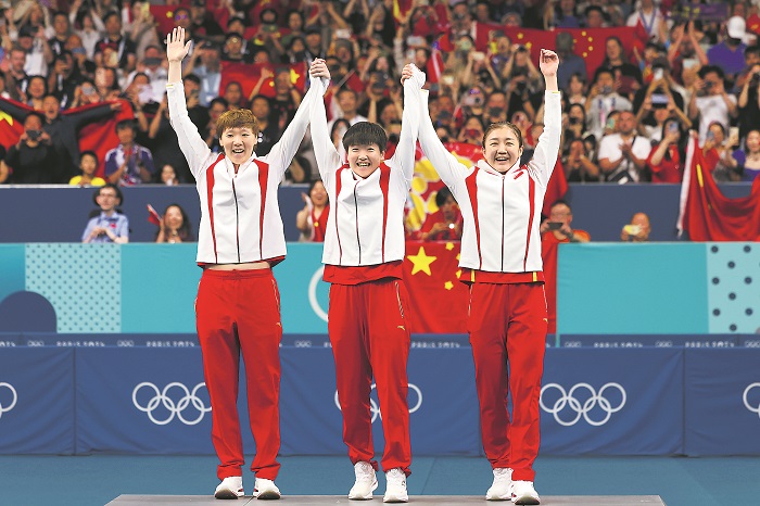 本报巴黎8月10日电(特派记者毕振山)当地时间8月10日下午,在巴黎奥运会乒乓球女子团体决赛中,由陈梦、孙颖莎、王曼昱组成的中国队以3比0战胜日本队,夺得金牌。至此,国乒包揽了本届奥运会乒乓球项目5枚金牌。