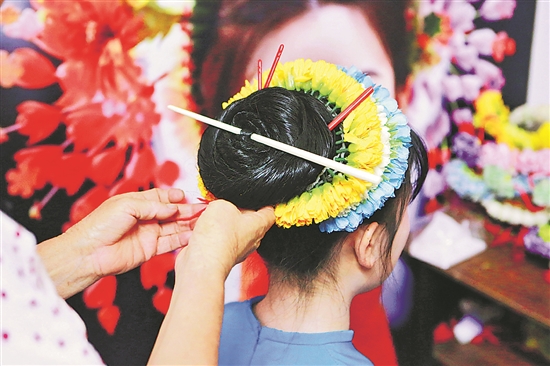 8月8日,福建省泉州市蟳埔村村民为游客簪花。