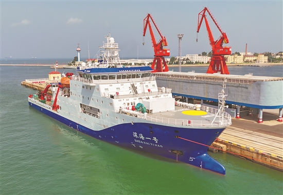 8月11日,在青岛大港码头,“深海一号”远洋科考船即将离境。当日,在青岛办结完出入境船舶监管手续后,携“蛟龙号”载人潜水器的“深海一号”解缆离境,赴西太平洋海域开展科考工作。新华社发(张进刚 摄)