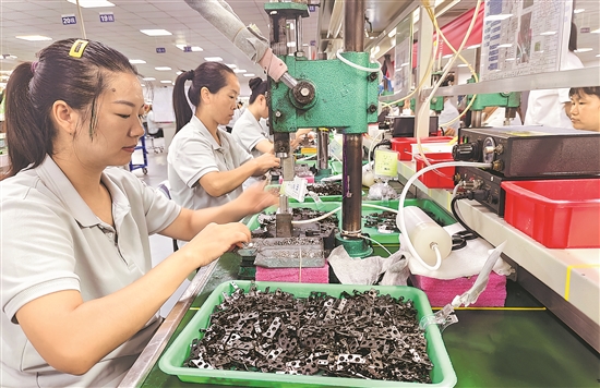近日,位于重庆万盛经开区南桐镇平山工业园区某生产车间,“妈妈岗”员工在生产线上进行组装作业。近年来,万盛经开区总工会推动民营企业做好建会入会工作,指导企业建立灵活用工机制,针对乡村留守妇女专门开设“妈妈岗”,既方便她们照顾家庭又促进就业。本报通讯员 曹永龙 摄