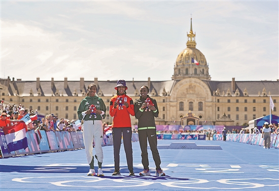 8月11日,荷兰选手茜凡·哈桑(中)获得巴黎奥运会女子马拉松比赛冠军。新华社记者 李京 摄