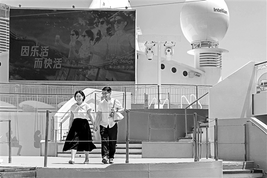 8月9日,一对新人在“蓝梦之歌”邮轮上参观。