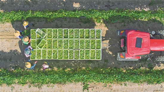 8月12日,采摘工在位于宁夏回族自治区贺兰山东麓银川市西夏区的志辉源石酒庄将酿酒葡萄装车(无人机照片)。