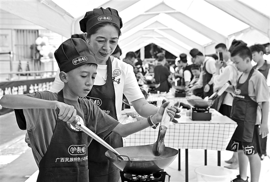 8月10日,孩子和家长在南宁市第一职业技术学校学煮老友粉。当日,广西南宁市第一职业技术学校举行老友粉研学活动,孩子和家长一起参观广西名小吃展示馆、学习老友粉制作技艺,独特的研学活动深受孩子和家长喜爱。新华社记者 周华 摄