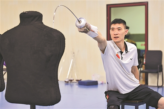 8月12日,中国轮椅击剑集训队(江苏组)运动员仲赛春在训练中。新华社发(苏阳 摄)