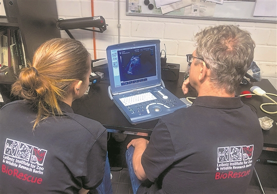 德国柏林动物园近日宣布,旅居柏林的中国大熊猫“梦梦”继2019年成功产下一对双胞胎后,再次确认怀孕,超声检测到两个胎儿的心跳。图为在德国首都柏林,工作人员为大熊猫“梦梦”做超声检测。