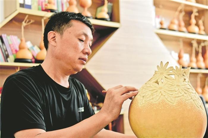 8月10日,在山东省济宁市微山县驩城镇西田陈村福禄葫芦合作社,村民在制作文创葫芦。